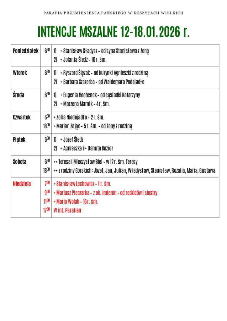 W okresie kolędowym w dni powszednie nie ma Mszy świętych wieczornych – z wyjątkiem czwartków i sobót – a w sprawach kancelaryjnych prosimy umawiać się telefonicznie