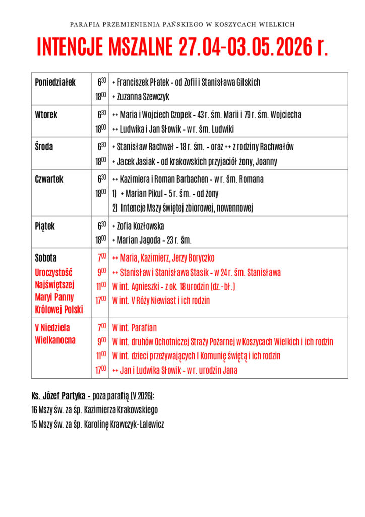 W najbliższą niedzielę podczas Eucharystii o godz. 9.00 będziemy modlić się za strażaków z OSP Koszyce Wielkie, dziękując również za ich uczestnictwo i pomoc w różnych wydarzeniach parafialnych.