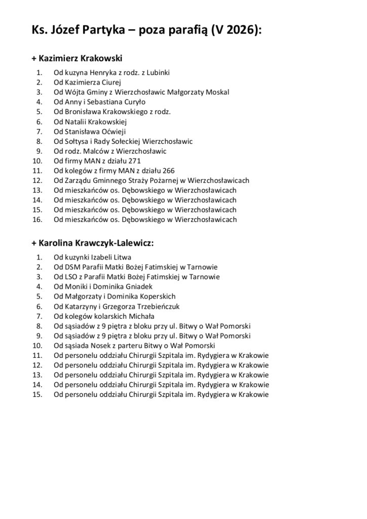Odeszli do wieczności: śp. Agnieszka Bober z ul. Pawłowskiego, której pogrzeb odbył się w środę, oraz śp. Wiesław Kozłowski z ul. Tarnowskiej – pogrzeb odbędzie się w Mielcu-Rzochowie w poniedziałek: Msza św. o godz. 14.30, pół godziny wcześniej różaniec.